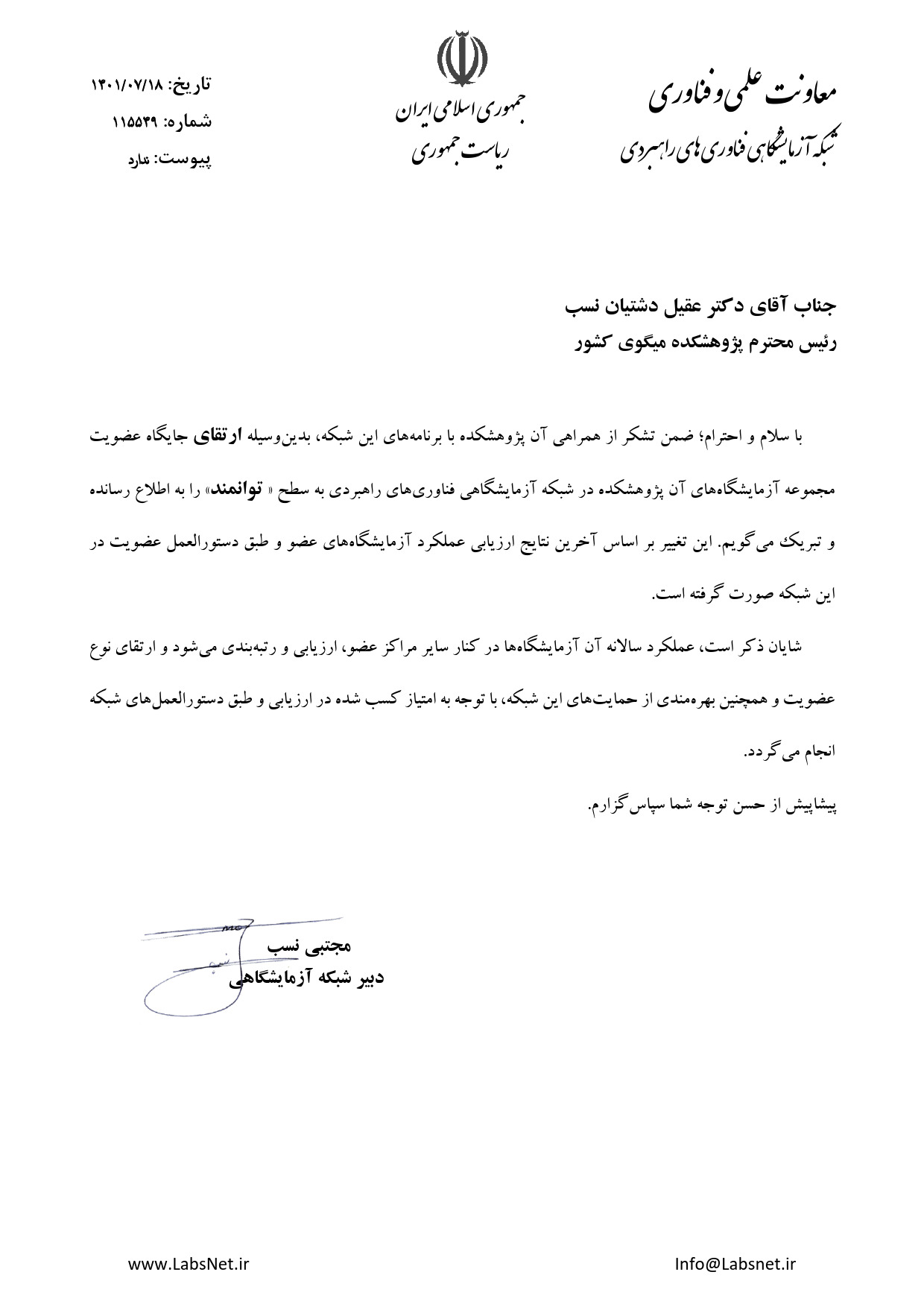ضمن تشکر از همراهی آن پژوهشکده با برنامه های این شبکه، بدین وسیله ارتقای جایگاه عضویت مجموعه آزمایشگاه های آن پژوهشکده در شبکه آزمایشگاهی فناوری راهبردی به سطح «توانمند» را به اطلاع رسانده و تبریک می گویم. این تغییر بر اساس آخرین نتایج ارزیابی عملکرد آزمایشگاه های عضو و طبق دستورالعمل عضویت در این شبکه صورت گرفته است.