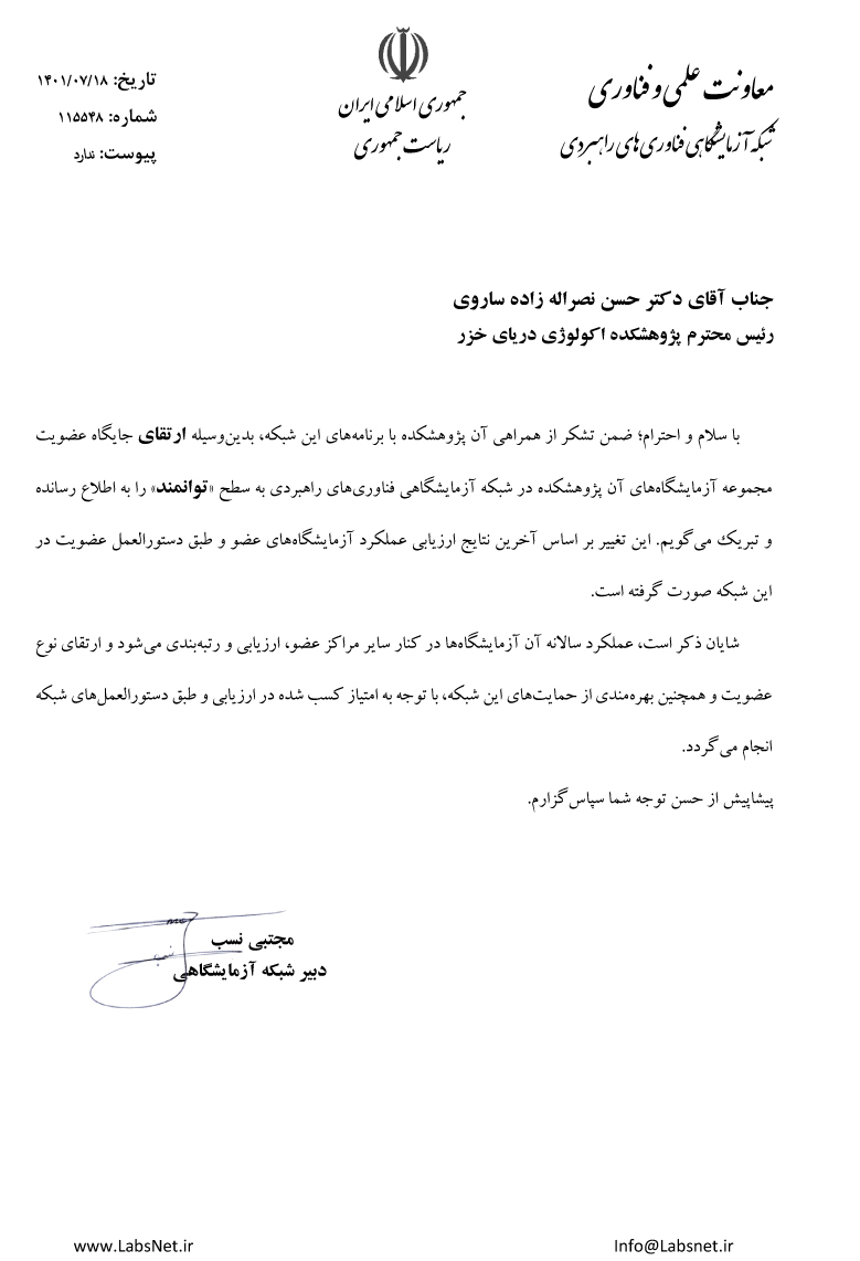 به گزارش روابط عمومی پژوهشکده اکولوژی دریای خزر_ ساری، طبق اعلام دبیر شبکه آزمایشگاهی معاونت علمی و فناوری ریاست جمهوری و بر اساس آخرین نتایج ارزیابی عملکرد آزمایشگاههای عضو که طبق دستورالعمل عضویت در این شبکه صورت گرفته است مجموعه آزمایشگاههای پژوهشکده با عملکردی که در سال 1400 داشت، توانست به سطح آزمایشگاههای توانمند آن معاونت ارتقاء پیدا کنند. مدیریت پژوهشکده این موفقیت را که حاصل تعهد، تلاش و تخصص کارشناسان مجرب تحقیقاتی اعلام کرد و به همکاران تبریک گفت و اظهار امیدواری کرد تا این موفقیت ها تداوم داشته باشد.