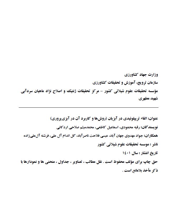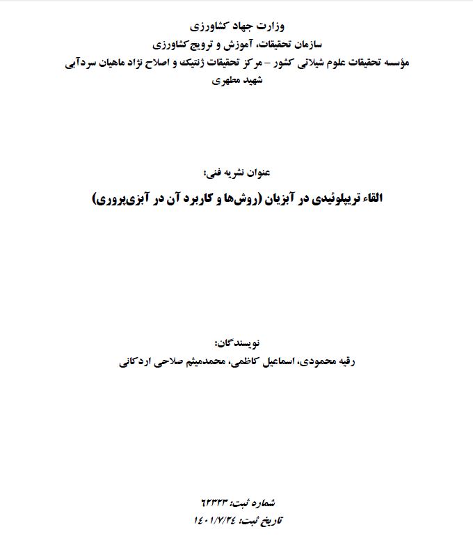 به گزارش روابط عمومی مرکز تحقیقات ژنتیک و اصلاح نژاد ماهیان سردآبی شهید مطهری یاسوج، نشریه فنی با عنوان القاء تریپلوئیدی در آبزیان (روش ها و کاربرد آن در آبزی پروری) با نگارش دکتر رقیه محمودی، عضو هیات علمی و رئیس گروه بخش آبزی پروری مرکز و همکاران منتشر شد. این نشریه مورخه 24 مهر 1401 با شماره فروست 62323 در مرکز فناوری اطلاعات و اطلاع رسانی کشاورزی سازمان تحقیقات، آموزش و ترویج کشاورزی ثبت گردید. در این نشریه مکانیسم و نحوه القاء تریپلوئیدی، روش های القاء، عوامل موثر بر موفقیت القاء تریپلوئیدی، القاء تریپلوئیدی در ماهیان قزل آلای رنگین کمان، ماهی کپور علف خوار، ماهی کپور معمولی، سی باس، تیلاپیای قرمز، تیلاپیای سیاه، آزاد دریای شمال و میگوی سفید، مزایا و معایب پرورش ماهیان تریپلوئید و کاربرد آن در آبزی پروری به منظور بهره برداری کاربران، کارشناسان و پرورش دهندگان آبزیان آورده شده است.