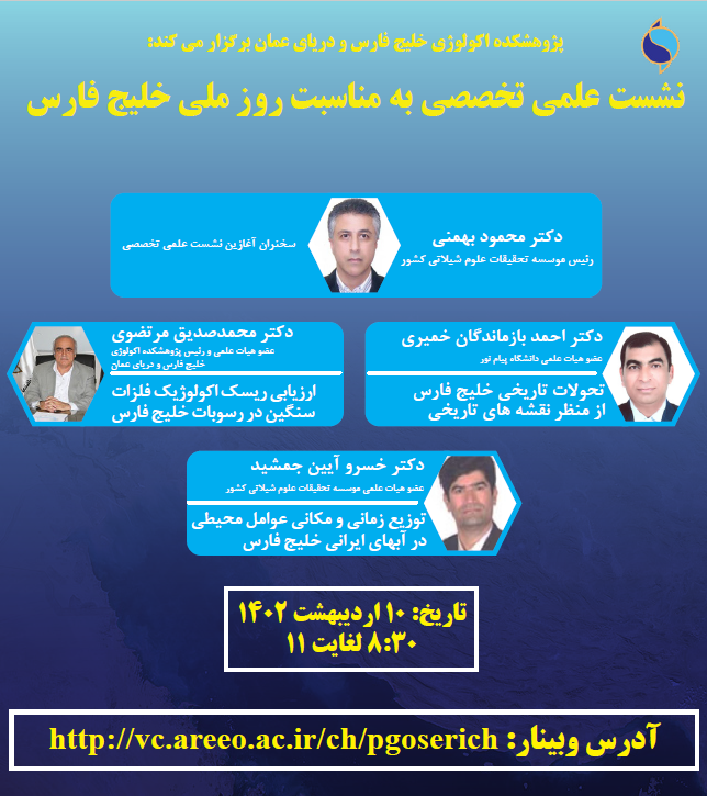 به گزارش روابط عمومی پژوهشکده اکولوژی خلیج فارس و دریای عمان – بندرعباس، به مناسبت دهم اردیبشت ماه روز ملی خلیج فارس، نشست علمی تخصصی با حضور دکتر بهمنی رئیس موسسه تحقیقات علوم شیلاتی کشور، دکتر بازماندگان عضو هیات علمی دانشگاه پیام نور هرمزگان، دکتر آئین جمشید عضو هیات علمی پژوهشکده میگوی کشور و دکتر مرتضوی رئیس پژوهشکده اکولوژی خلیج فارس و دریای عمان، روسا و کارشناسان مراکز تحقیقاتی وابسته به موسسه تحقیقات علوم شیلاتی کشور، کارشناسان و مدیران ادارات شیلات و محیط زیست و سایر ارگانهای استان های ساحلی خلیج فارس و جمع کثیری از دانشگاهیان و دانشجویان به صورت مجازی برگزار شد. دکتر محبی معاون پژوهشی پژوهشکده ضمن تبریک روز ملی خلیج فارس و اشاره به اهمیت و ضرورت برگزاری نشست های تخصصی به معرفی سخنرانان و برنامه نشست پرداخت.