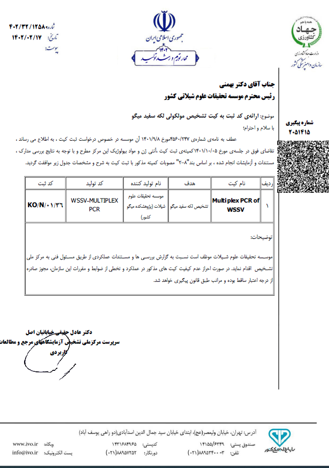 به گزارش روابط عمومی موسسه تحقیقات علوم شیلاتی کشور، در نامه سرپرست مرکزملی تشخیص آزمایشگاههاي مرجع و مطالعات کاربردی آمده است: با توجه به نتایج بررسی مدارك، مستندات و آزمایشات انجام شده، بر اساس بند «8-2» مصوبات کمیته مذکور با ثبت کیت موافقت گردید.