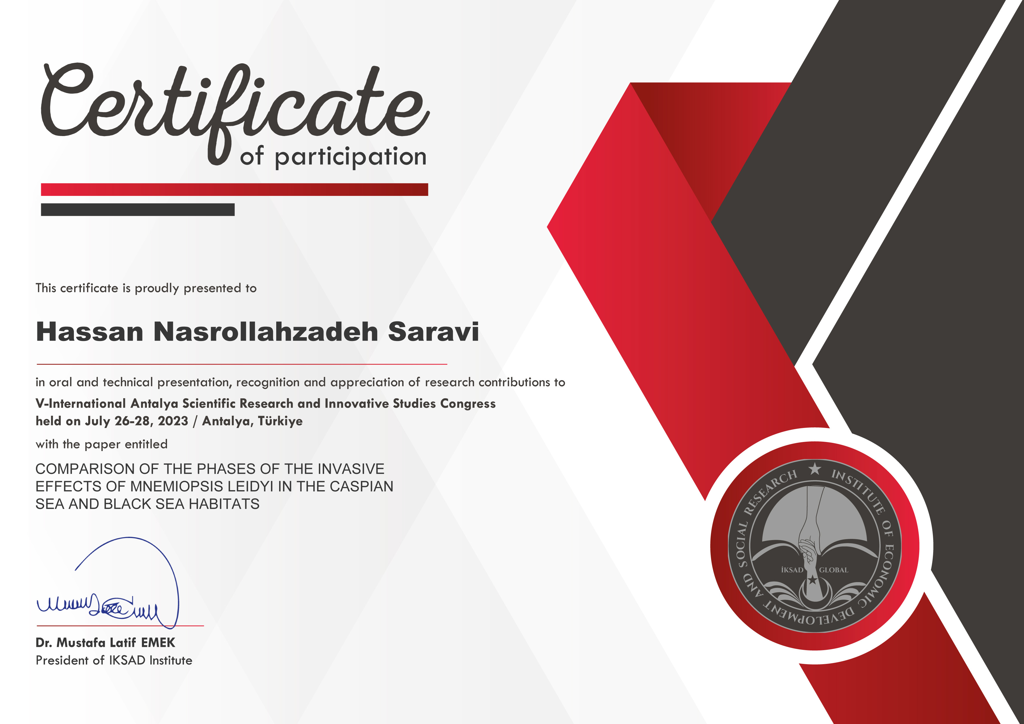 در این مقاله که با عنوان: "COMPARISON OF THE PHASES OF THE INVASIVE EFFECTS OF MNEMIOPSIS LEIDYI IN THE CASPIAN SEA AND BLACK SEA HABITATS" ارائه شد چهار نفر از همکاران دیگر از جمله: دکتر نیما پورنگ از موسسه تحقیقات علوم شیلاتی کشور، خانم مهندس آسیه مخلوق، خانم مهندس مرضیه رضایی و آقای احد احمدنژاد از پژوهشکده اکولوژی دریای خزر مشارکت داشتند.