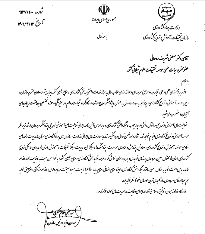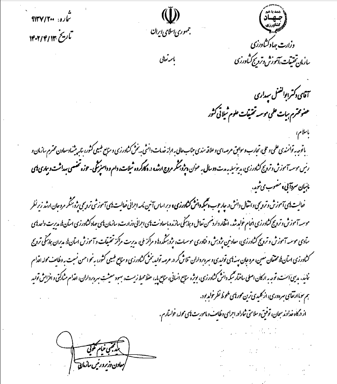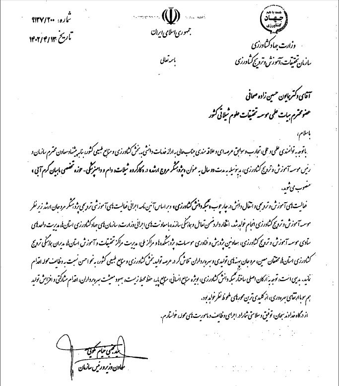 به گزارش روابط عمومی موسسه تحقیقات علوم شیلاتی کشور، بر اساس مصوبه جلسه چهل و پنجم هیات امنای سازمان تحقیقات، آموزش و ترویج کشاورزی، به منظور ایجاد سازو کاری بهتر برای بهره گیری از تجارب علمی و عملی پژوهشگران و به منظور انتقال و تسهیم اثر بخش دانش و فناوری برای کمک به ارتقای بهره وری عوامل تولید در پهنه های کشاورزی، انتخاب برخی محققان به عنوان پژوهشگر مروج ارشد در دستور کار سازمان تحقیقات، آموزش و ترویج کشاورزی قرار گرفت و مصطفی شریف روحانی در حوزه تخصصصی بهداشت و بیماری های آبزریان، ابوالفضل سپهداری در حوزه تخصصی بهداشت و بیماری های ماهیان سردآبی و همایون حسین زاده صحافی در حوزه تخصصی ماهیان گرمابی به مدت دو سال به عنوان پژوهشگر مروج ارشد موسسه تحقیقات علوم شیلاتی کشور، انتخاب شدند.