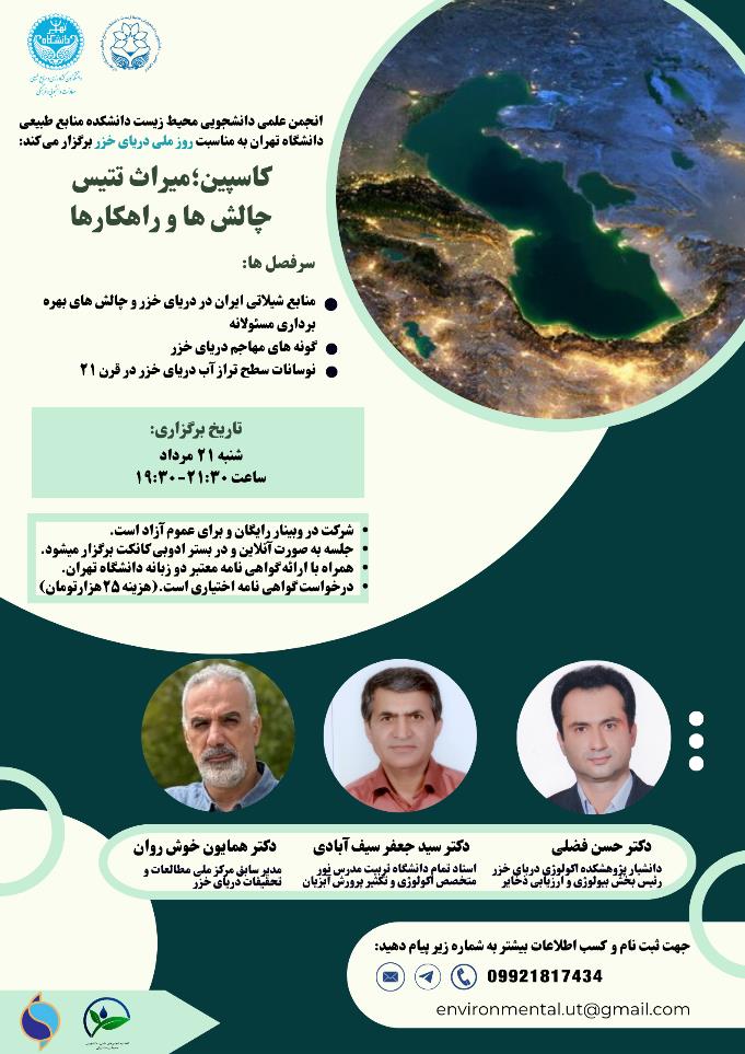 به گزارش روابط عمومی پژوهشکده اکولوژی دریای خزر_ ساری، وبینار تخصصی کاسپین، میراث تتیس چالش ها و راهکارها به مناسبت روز ملی دریای خزر توسط انجمن علمی دانشجویی محیط زیست دانشگاه تهران برگزار شد. در این وبینار تخصصی چالش های اساسی که دریای خزر با آن روبرو است و همچنین راهکارهای برون رفت توسط سه سخنران در زمینه های مختلف تغییر اقلیم و کاهش سطح آب دریای خزر و اثرات آن بروی منابع زیستی دریای خزر و گونه های مهاجم مطالب جامعی ارائه کردند. حسن فضلی عضو هیئت علمی پژوهشکده ضمن ارائه وضعیت صید و ذخایر گونه های مختلف ماهیان دریای خزر در سواحل ایران، در خصوص چالش های اصلی بهره برداری مسئولانه از منابع شیلاتی دریای خزر سخنرانی کرد. ایشان ضمن تاکید بر اثرات دو مولفه کاهش سطح آب دریای خزر و افزایش دما بر روی ذخایر ماهیان این دریا، در راستای بهره برداری مسئولانه مواردی از جمله: اثرات صید بیش از حد، رعایت زمان شروع و خاتمه صید، رعایت استانداردهای ادوات صید و صیادی و فعالیت صیادان غیر مجاز و همچنین از استفاده ادوات صیادی غیر مجاز بر روی منابع شیلاتی مطالبی ارائه کرد.