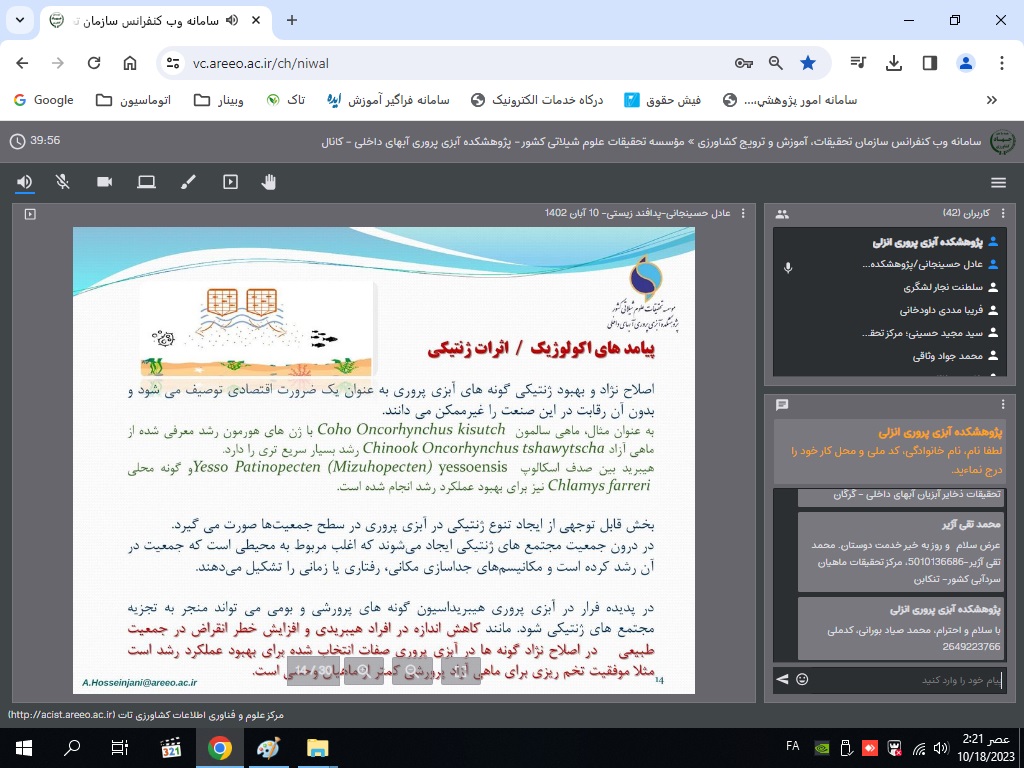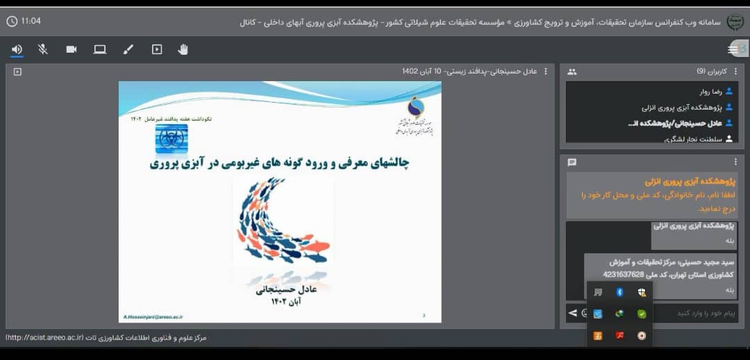 به گزارش روابط عمومی پژوهشکده آبزی پروری آبهای داخلی کشور_ گیلان، کارگاه آموزشی با عنوان "چالش های معرفی و ورود گونه های غیر بومی در آبزی پروری" توسط عادل حسینجانی از محققین پژوهشکده به صورت وبیناری با هدف آشنایی شرکت کنندگان با پیامدهای اکولوژیکی، ژنتیکی، بیولوژیکی معرفی و ورود گونه های غیر بومی به منابع آبی کشور برگزار گردید. سخنران ضمن اشاره به مزایای معرفی گونه های جدید غیر بومی در آبزی پروری، به ارایه و لزوم توجه به راهکارهای مدیریتی از جمله: ارزیابی ریسک اکولوژیک پیش از ورود گونه های مذکور به آبزی پروری و منابع آبی کشور پرداخت.