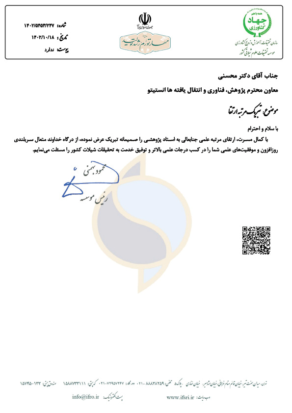 با کمال مسرت، ارتقاي مرتبه علمی جنابعالی به استاد پژوهشی را صمیمانه تبریک عرض نموده، از درگاه خداوند متعال سربلندي روزافزون و موفقیتهاي علمی شما را در کسب درجات علمی بالاتر و توفیق خدمت به تحقیقات شیلات کشور را مسئلت می نمایم.