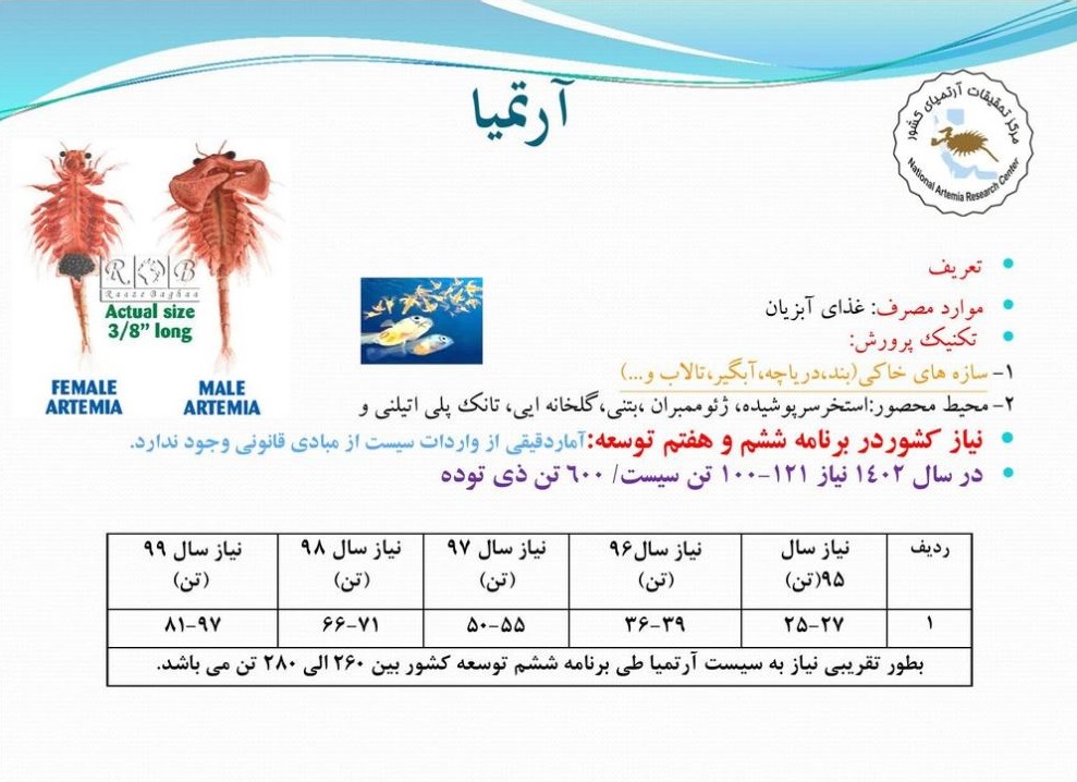 به گزارش روابط عمومی مرکز تحقیقات آرتمیای کشور_ ارومیه، با هدف ارتقاء سطح اطلاعات و آگاهی کارشناسان نظام مهندسی کشاورزی استان آذربایجان غربی، دوره آموزشی_ ترویجی با عنوان "روش های متداول تولید سیست و بیومس آرتمیا" با همکاری مدیریت هماهنگی ترویج سازمان جهاد کشاورزی استان با مشارکت کارشناسان مرتبط، بهره برداران و آبزی پروران در سراسر کشور در شبکه برکت، استودیو کشاورزی آذربایجان غربی توسط علی نکوئی فرد، مدرس دوره و رئیس مرکز مزبور به صورت وبیناری برگزار شد. وی مباحثی از قبیل: تاریخچه شناخت بشر از آرتمیا و مناطق جغرافیایی پراکنش آرتمیا در جهان و ایران و نیاز جهانی و کشور به این خوراک استراتژیک و اهمیت آن در صنعت آبزی پروری و تنوع استفاده از محصولات مختلف آن در تغذیه آبزیان و شرایط اخذ مجوزهای تولید و شاخص های مورد نیاز در تولید آرتمیا و نحوه محاسبه نیازمندی های انواع لارو آبزیان به آرتمیا را تشریح کرد.
