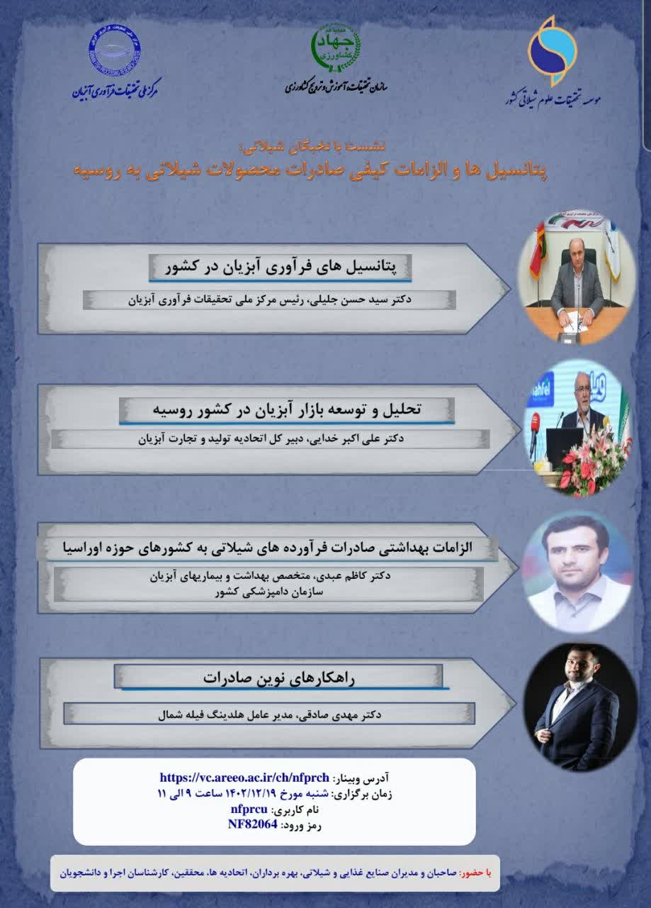 به گزارش روابط عمومی مرکز ملی تحقیقات فرآوری آبزیان_ یونیدو، نشست تخصصی با نخبگان شیلاتی تحت عنوان "پتانسیل ها و الزامات کیفی صادرات محصولات شیلاتی به روسیه" به صورت وبیناری برگزار شد. در نخستین سخنرانی، حسن جلیلی، رئیس مرکز به بیان اهداف نشست و فرآوری آبزیان، مباحث صنایع تبدیلی در بخش کشاورزی به ویژه صنایع شیلاتی و ارزش های پنهان منابع شیلاتی و پتانسیل های تجارت محصولات شیلاتی در بازارهای داخلی و بین المللی، ارزیابی مقایسه ای تولید، واردات و صادرات آبزیان و محصولات آنها در ایران و کشورهای همسایه شمالی، توانمندی های کشور در حوزه فرآوری آبزیان و مولفه های اصلی تولید و بازار یابی فرآورده های دریایی پرداخت. سپس عبدی، مدیرکل بهداشت و بیماری های سازمان دامپزشکی کشور ضمن بیان قوانین و مقررات صادرات فرآورده های شیلاتی به اتحادیه اقتصادی اوراسیا، در مورد میزان کل واردات و صادرات آبزیان بویژه میگو و خاویار پرورشی به روسیه از سال های 1390 تا 1401 و ارزش دلاری آنها، معرفی مرجع ذیصلاح روسیه در کنترل فرآورده های شیلاتی صحبت کرد. در ادامه توضیحاتی در مورد فرآورده های قانونی و غیر قانونی شیلاتی جهت صادرات و قوانین و الزامات بهداشتی فرآیند تولید تا عرضه فرآورده های شیلاتی در کارگاه های فرآوری آبزیان، الزامات GMP بر اساس این قانون و همچنین الزامات صید، الزامات ایمنی تولید غذاهای خاص، الزامات بهداشتی مرتبط با ماهی و فرآورده های شیلاتی، نحوه تایید فرآورده های وارداتی به CU، الزامات بهداشتی صادرات ماهی تازه (قزل آلا) به اوراسیا ارائه کرد.