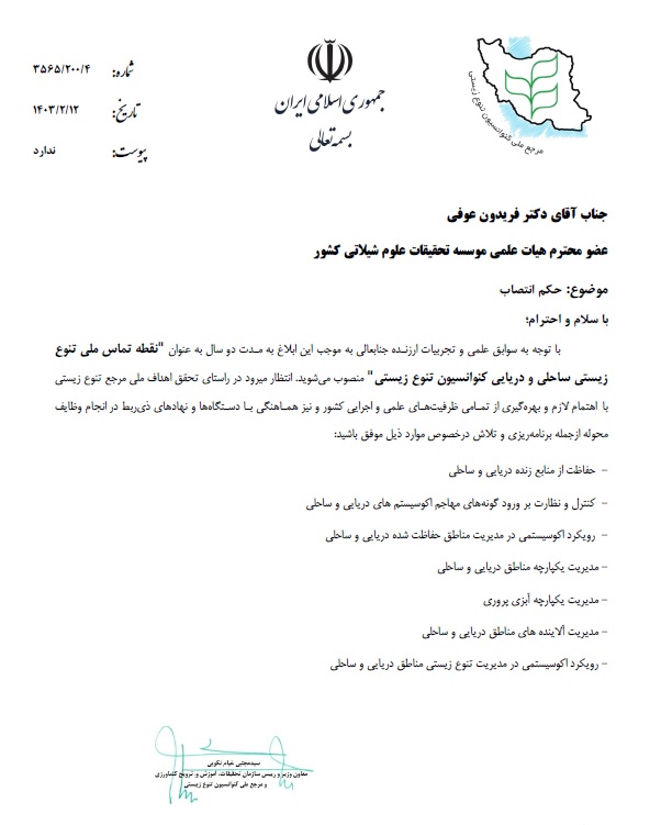 با توجه به سوابق علمی و تجربیات ارزنده ، جنابعالی به مدت دو سال به عنوان ( نقطه تماس ملی تنوع زیستی ساحلی و دریایی کنوانسیون تنوع زیستی ) منصوب می شوید . انتظار می رود در راستای تحقق اهداف ملی مرجع تنوع زیستی با اهتمام لازم و بهره گیری از تمامی ظرفیت های علمی و اجرایی کشور و نیز هماهنگی با دستگاه ها و نهاد های ذیربط در انجام وظایف محوله موفق باشید.