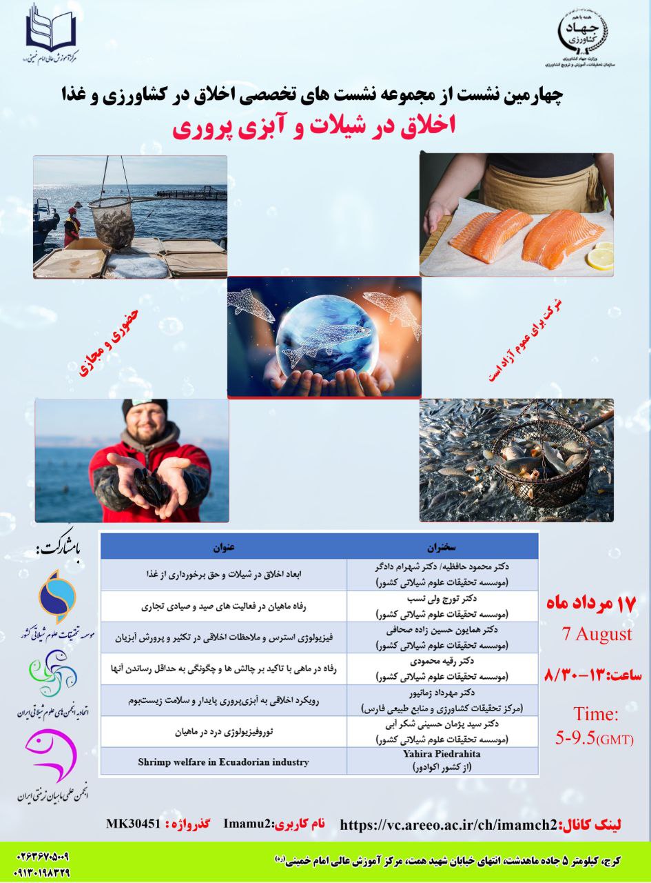 به گزارش روابط عمومی مرکز تحقیقات ژنتیک و اصلاح نژاد ماهیان سردآبی شهید مطهری یاسوج، چهارمین نشست از مجموعه نشست های تخصصی اخلاق در کشاورزی و غذا با موضوع اخلاق در شیلات و آبزی پروری " توسط مرکز آموزش عالی امام خمینی (ره) و با مشارکت موسسه تحقیقات علوم شیلاتی کشور، اتحادیه انجمن های علوم شیلاتی ایران و انجمن علمی ماهیان زینتی ایران، با سخنرانی 8 نفر از محققین کشور به صورت حضوری و مجازی برگزار شد.