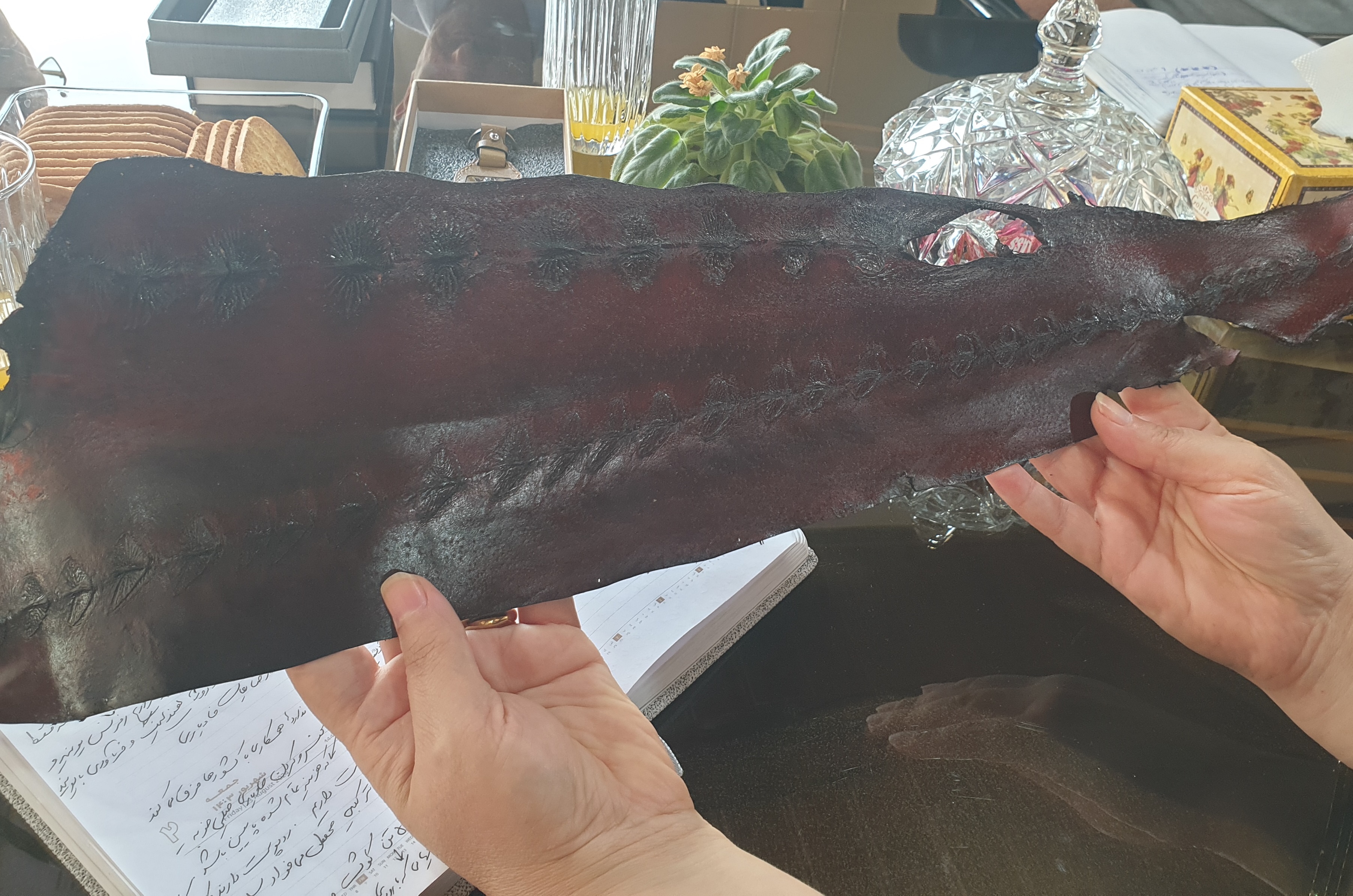 در ادامه نشست برخی محصولات چرمی تولید شده از پوست ماهیان خاویاری نمایش داده شد.