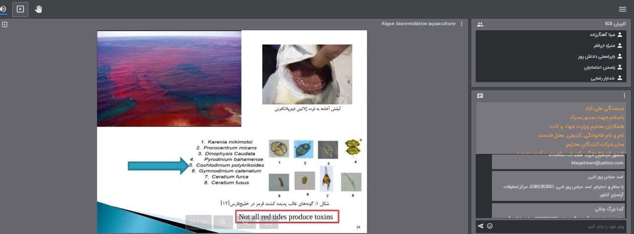 سید پژمان حسینی شکرابی، عضو هیأت علمی موسسه تحقیقات علوم شیلاتی کشور (مرکز تحقیقات ملی آبزیان آبهای شور) به ارائه مباحثی در زمینه بررسی گونهای ریزجلبکی موثر در تصفیه پساب، زمینه شناخت و ترکیبات پساب مزارع پرورشی، اهمیت تصفیه پساب مزارع پرورش ماهی، شناخت ریزجلبکهای آب شیرین تا شور، نیازهای غذایی ریزجلبکها، روشهای کشت جلبک در پساب خروجی مزارع پرورش ماهی، تاثیر روشهای مختلف برداشت بر ترکیبات ریزجلبکها و محصولات قابل استحصال از ریزجلبکها بصورت حضوری پرداخت.