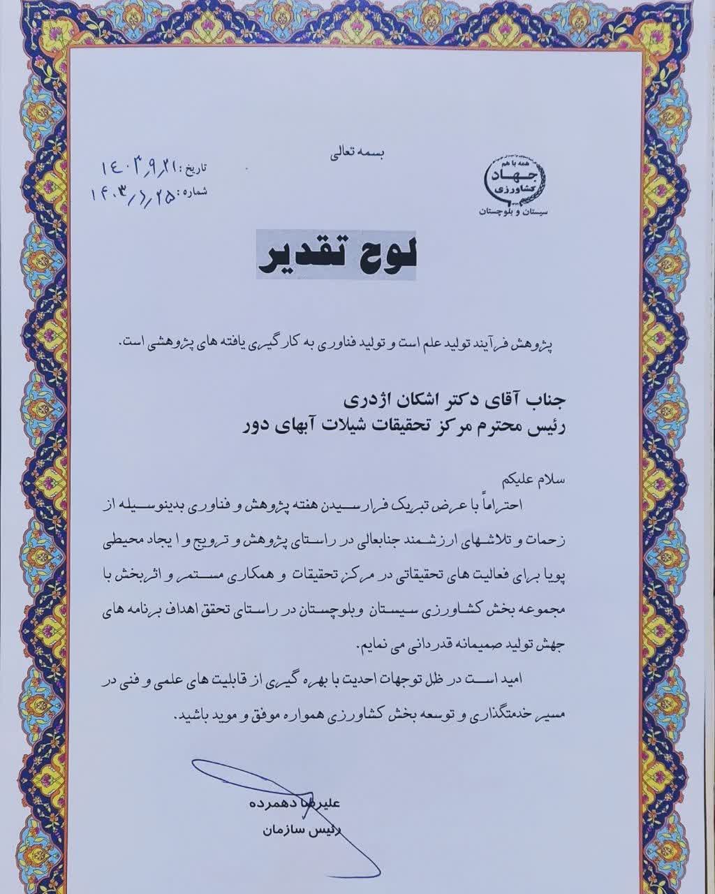 همچنین اظهار کرد: برنامه جهش تولید در بخش کشاورزی سیستان و بلوچستان تدوین و در سطح استان در حال اجراست و همراهی محققان بخش کشاورزی و شیلاتی را می طلبد تا اهداف این برنامه در قالب زمانی مشخص محقق شود. در پایان از زحمات رؤسای مراکز تحقیقات استان تقدیر شد.