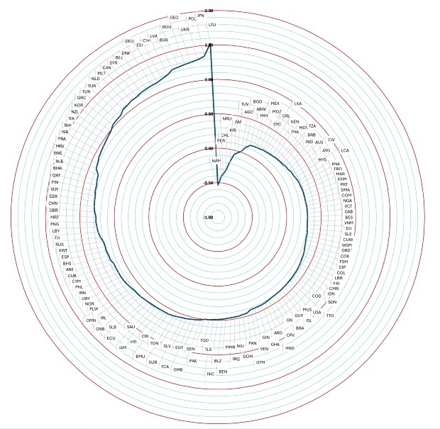 تغییرات میانگین متحرک سه ساله دمای سطح دریا (SST) برای آب های ساحلی_ دریایی بررسی 148 کشور_ سرزمین طی سال های 2023_ 2021 در مقایسه با خط پایه 1983_ 1981.