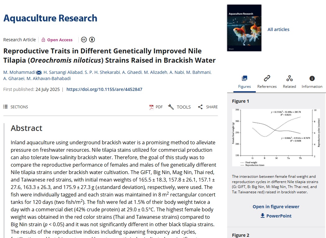 این پژوهش توسط محمد محمدی، عضو هیئتعلمی مرکز، به همراه تیم تحقیقاتی انجام شد و به بررسی عملکرد تولیدمثلی پنج سویه اصلاحنژادشده از تیلاپیای نیل شامل GIFT، Big Nin، Mag Nin، Thai Red و Taiwanese Red در شرایط آب لبشور منطقه بافق پرداخت.