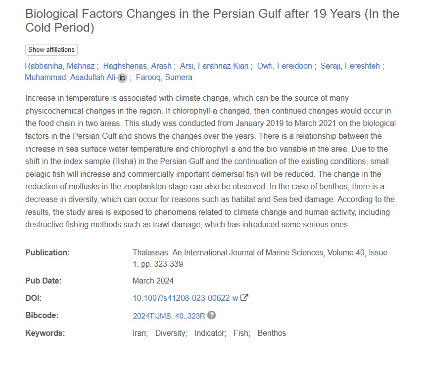 به گزارش روابط عمومی مؤسسه تحقیقات علوم شیلاتی کشور، پژوهش مشترک محققان مؤسسه و دانشگاه کراچی پاکستان با تمرکز بر بررسی دو دهه تغییرات اقلیمی و پیامدهای آن بر شاخصهای زیستی خلیج فارس، در سال ۲۰۲۴ در ژورنال An International Journal of Marine Sciences منتشر شد.