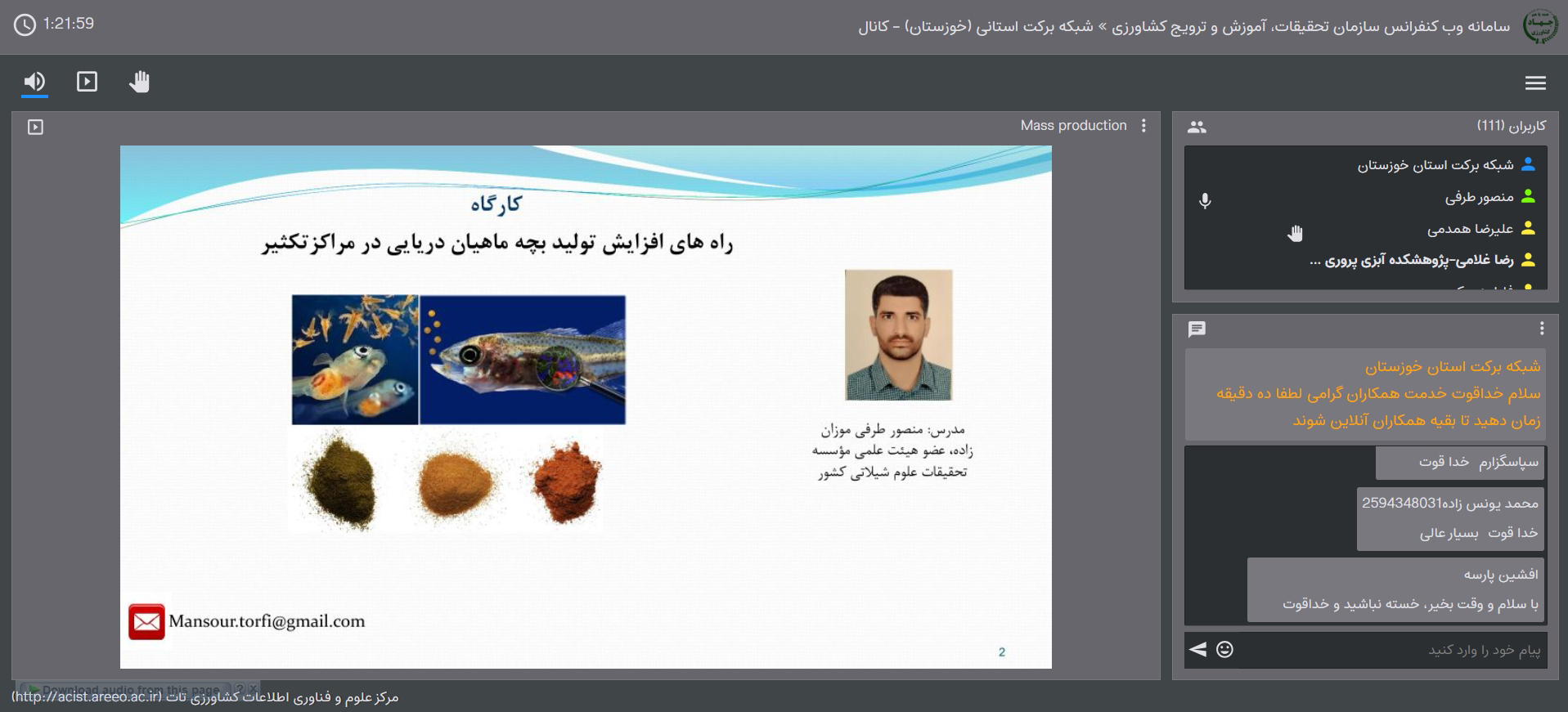 به گزارش روابط عمومی پژوهشکده آبزیپروری آبهای جنوب کشور، روز پنجشنبه ۲۲ شهریورماه ۱۴۰۴ کارگاه آموزشی وبیناری با موضوع «راههای افزایش تولید بچهماهیان دریایی در مراکز تکثیر» برگزار شد؛ این کارگاه با ارائه منصور طرفی موزانزاده، عضو هیئت علمی پژوهشکده، به صورت آنلاین برگزار گردید.
