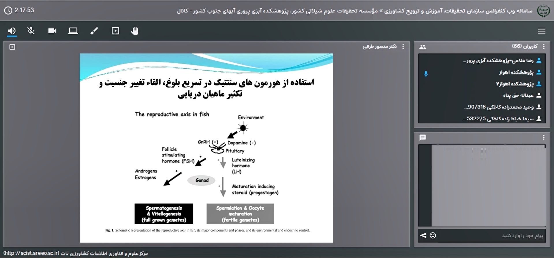 به گزارش روابط عمومی پژوهشکده آبزیپروری آبهای جنوب کشور، این نشست تخصصی با محوریت اقدامات، دستاوردها و برنامههای آتی پژوهشکده در حوزه ماهیان دریایی برگزار شد و سخنرانی «استفاده از هورمونهای سنتتیک در تسریع بلوغ، القای تغییر جنسیت و تکثیر ماهیان دریایی» در تاریخ ۱۸ آذرماه ارائه شد.