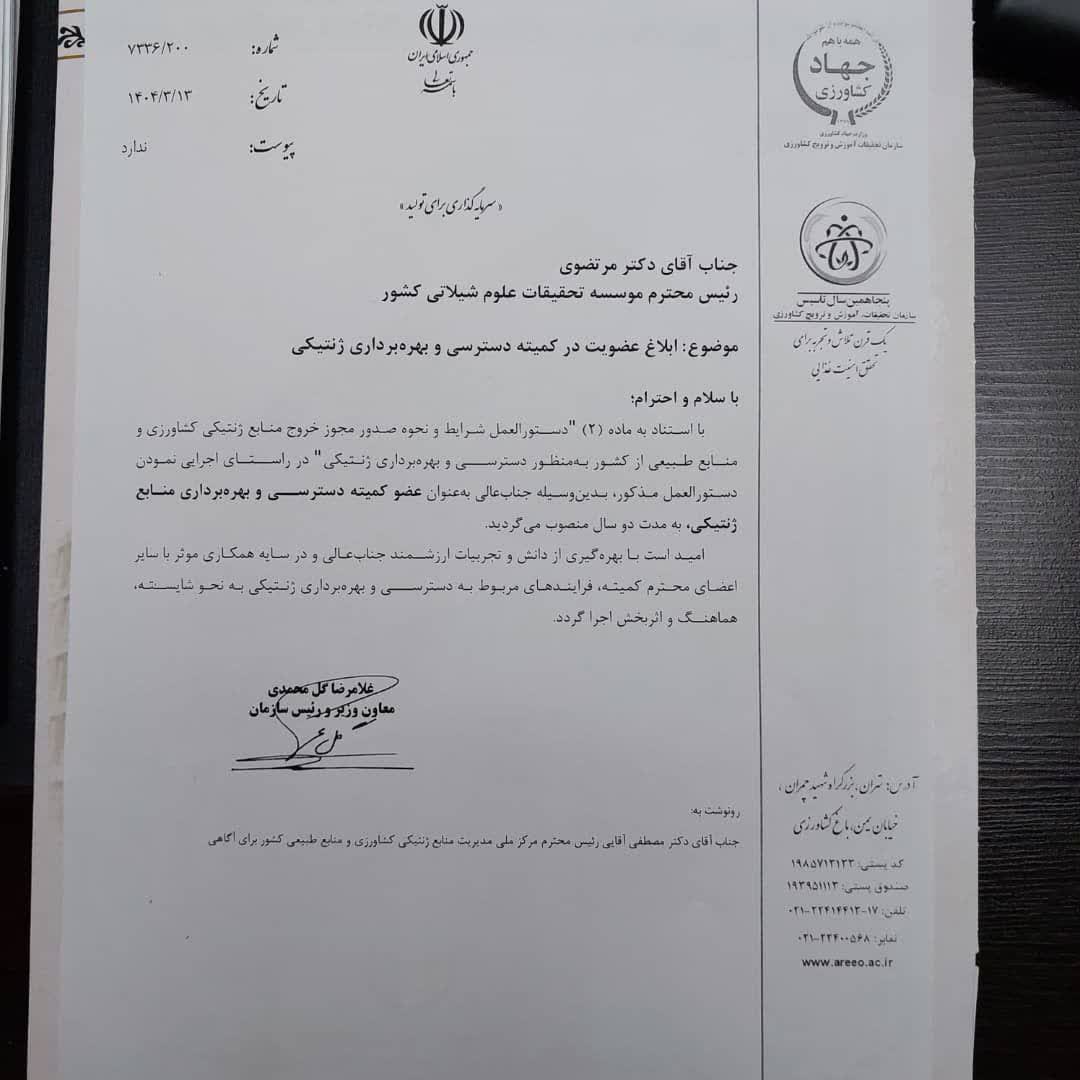 در متن این حکم ابراز امیدواری شده است با بهرهگیری از دانش، تخصص و تجربیات ارزشمند رئیس مؤسسه تحقیقات علوم شیلاتی کشور و همچنین تعامل و همکاری مؤثر با سایر اعضای محترم کمیته، فرآیندهای مرتبط با دسترسی و بهرهبرداری از منابع ژنتیکی بهصورت هماهنگ، هدفمند و اثربخش اجرا شود.