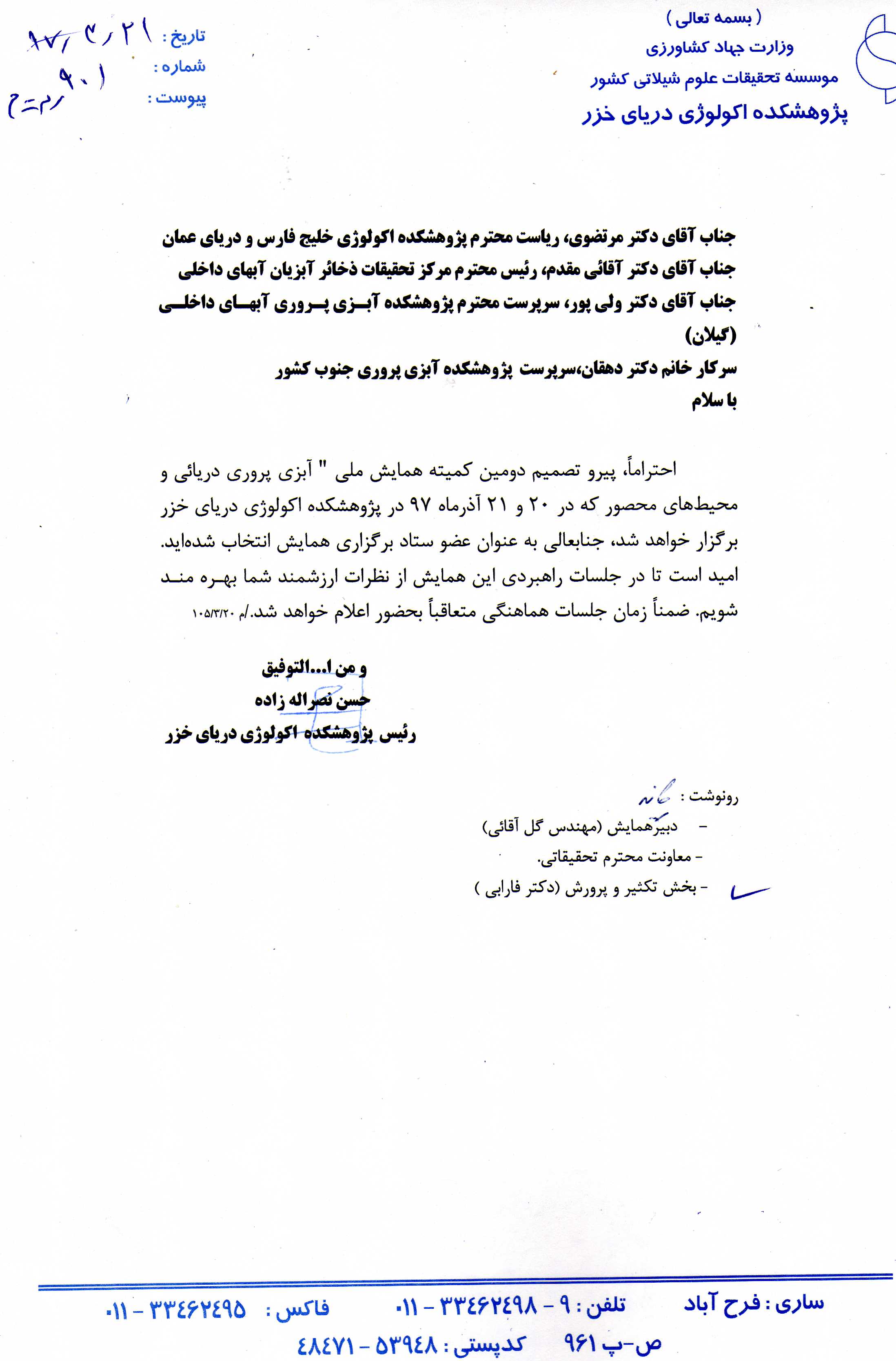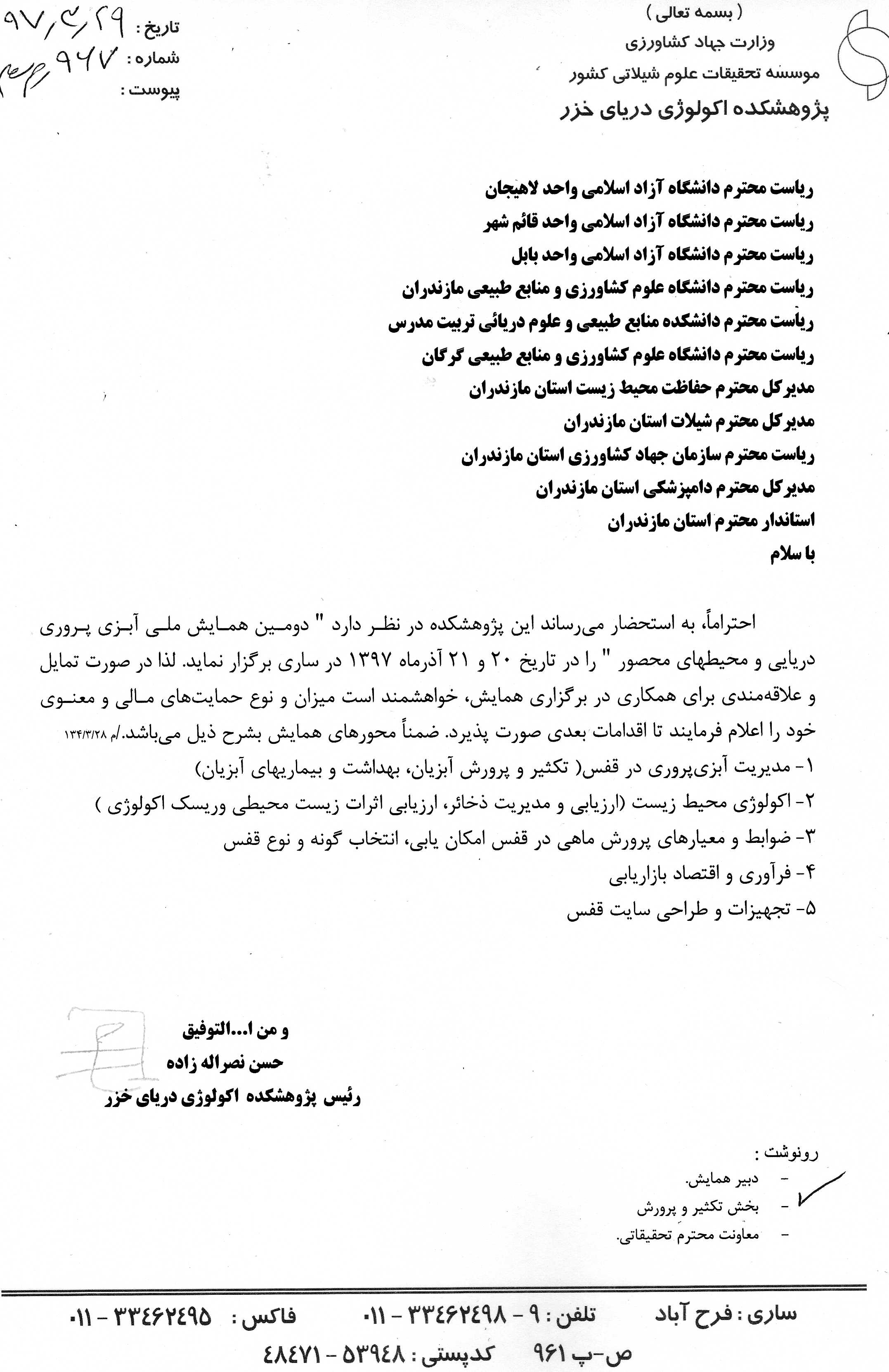 پژوهشکده اکولوژي آبزيان درياي خزر - یک شنبه هفدهم تیر 1397 ارسال دعوتنامه برای مشارکت در دومین همایش ملی " آبزی پروری دریایی و محیط های محصور" ارسال دعوتنامه برای مشارکت در دومین همایش ملی " آبزی پروری دریایی و محیط های محصور"