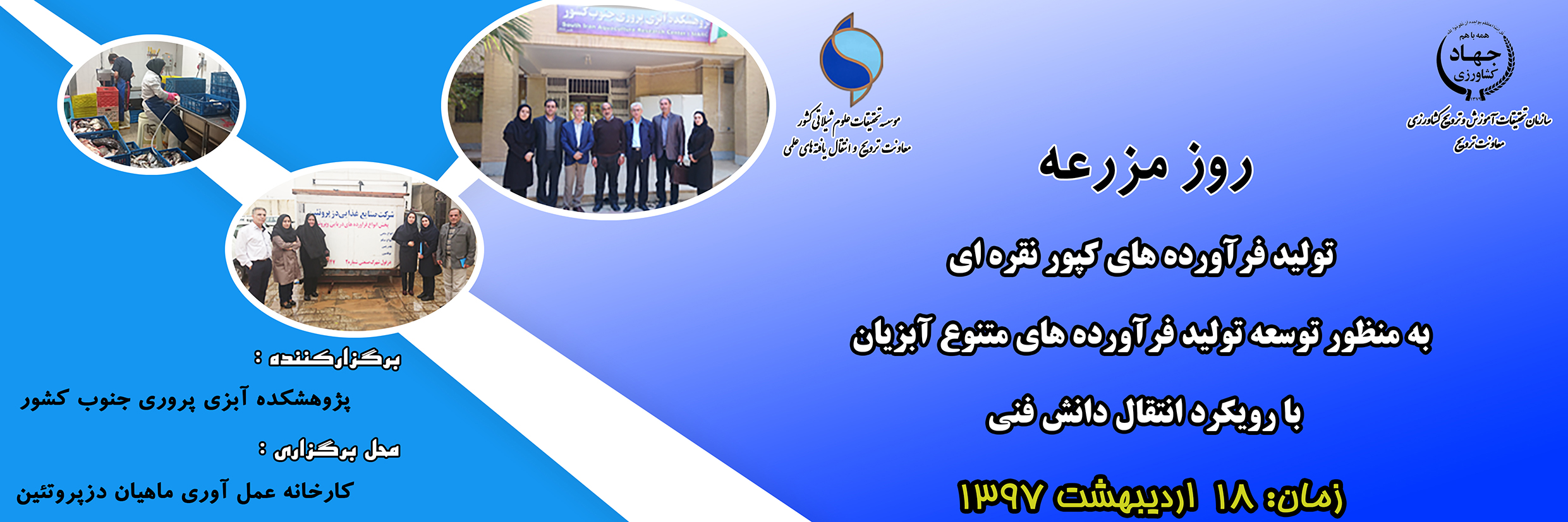 برگزاری روز مزرعه (تولید فرآورده های کپور نقره ای به منظور توسعه تولید فرآورده های متنوع آبزیان با رویکرد انتقال دانش فنی) مربوط به طرح ترویجی فرهنگ مصرف فرآورده های متنوع به تاریخ 18 اردیبهشت 1397 اطلاع رسانی شد. یکی از راه های اطلاع رسانی به منظور شرکت فراگیران در روز مزرعه از طریق سایت پژوهشکده و موسسه و ارسال پوستر بوده است.