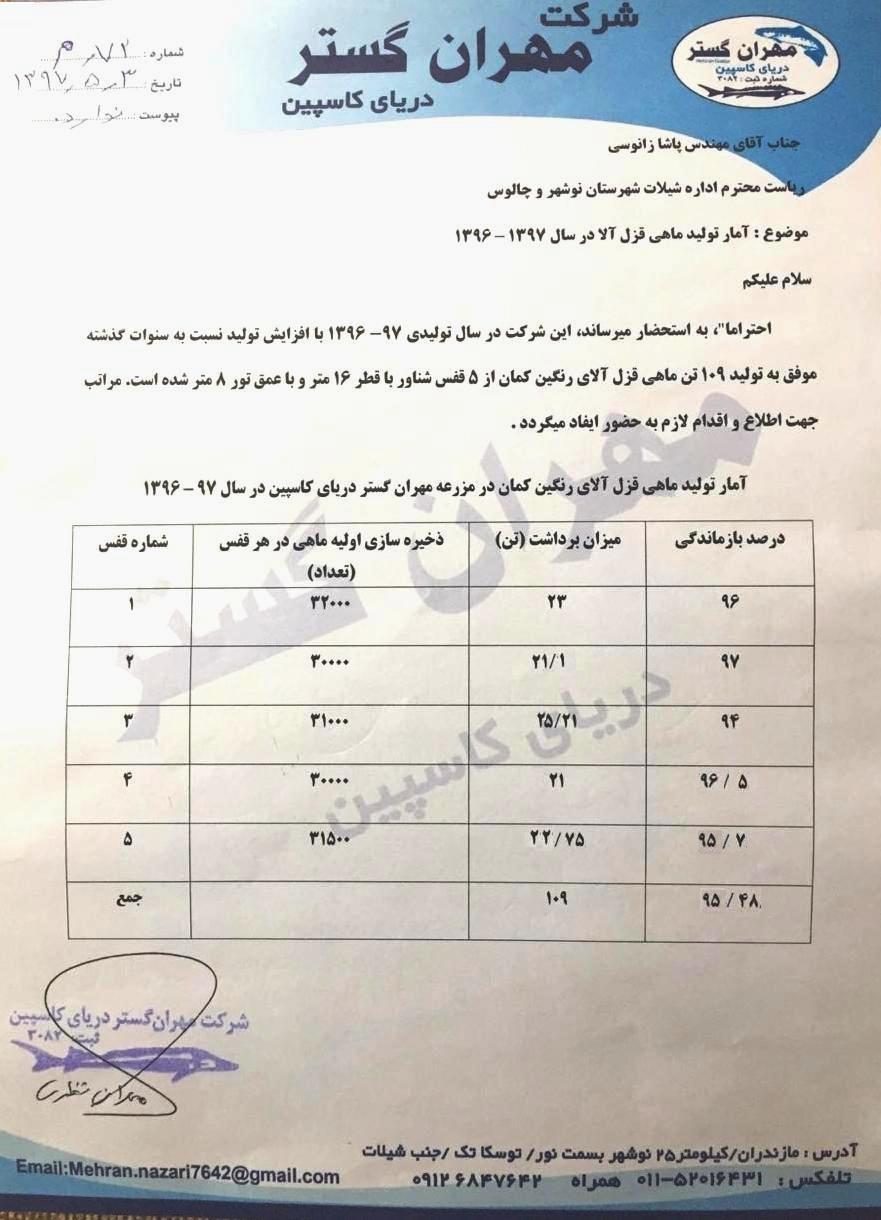 پژوهشکده اکولوژي آبزيان درياي خزر - شنبه بیست و هفنم مرداد 1397 آمار نهایی تولید مزرعه مهران گستر دریای کاسپین آمار نهایی تولید مزرعه مهران گستر دریای کاسپین