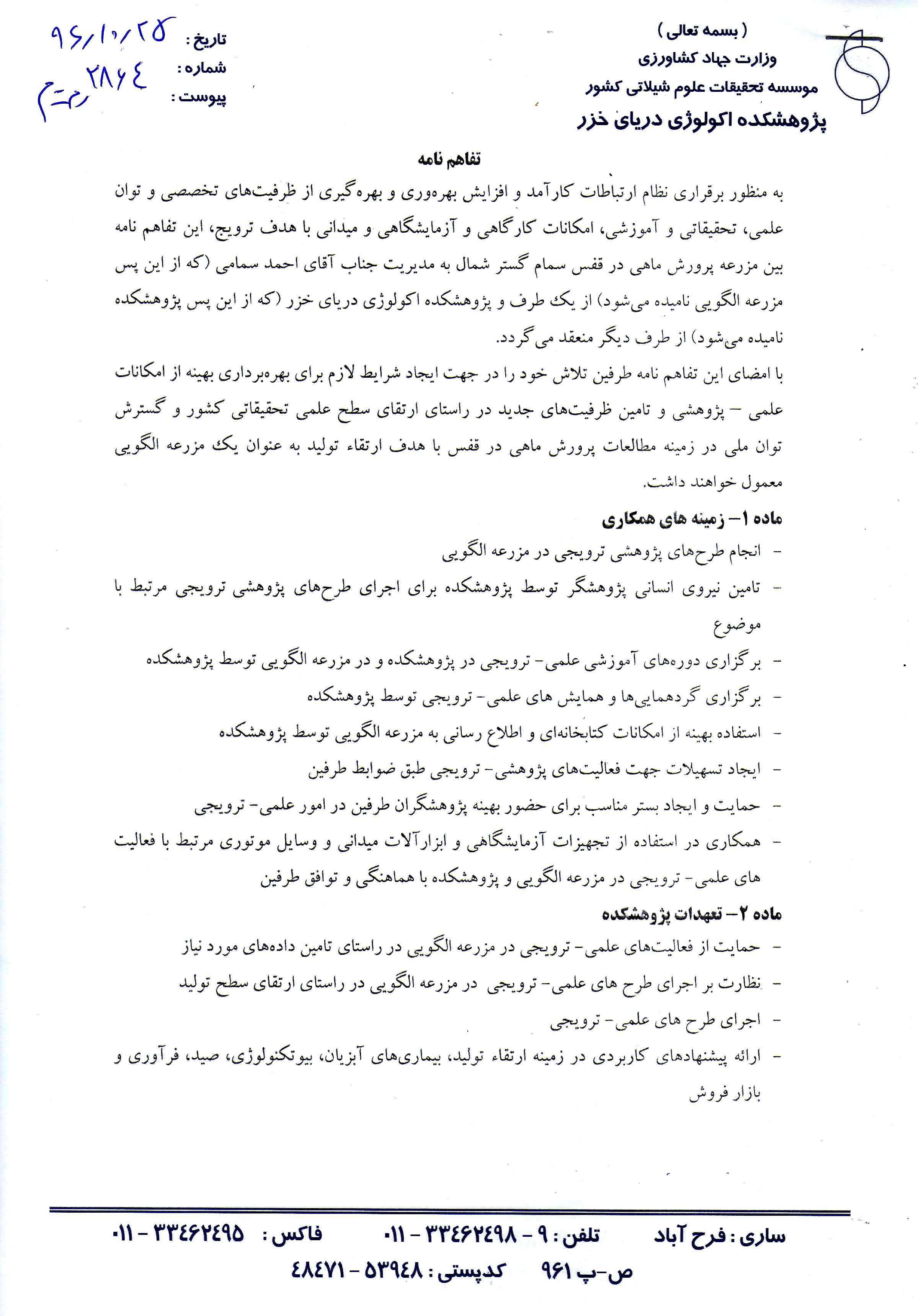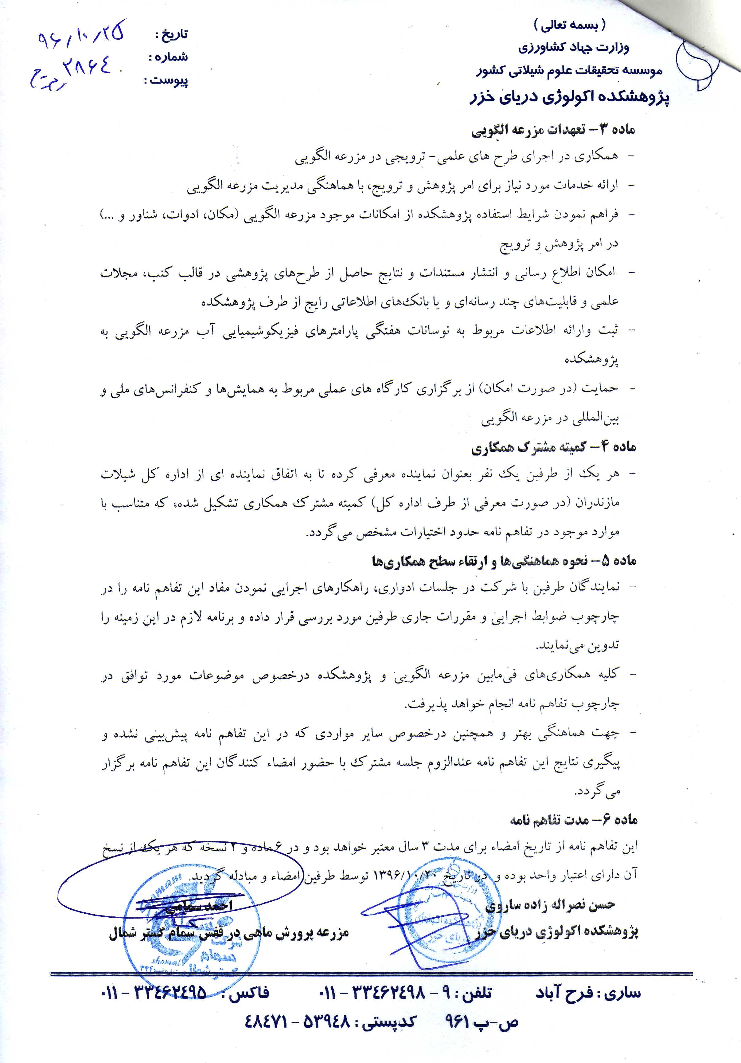 پژوهشکده اکولوژي آبزيان درياي خزر - چهارشنبه شانزدهم اسفند 1396 عقد تفاهم نامه با مزرعه سمام گستر شمال عقد تفاهم نامه با مزرعه سمام گستر شمال
