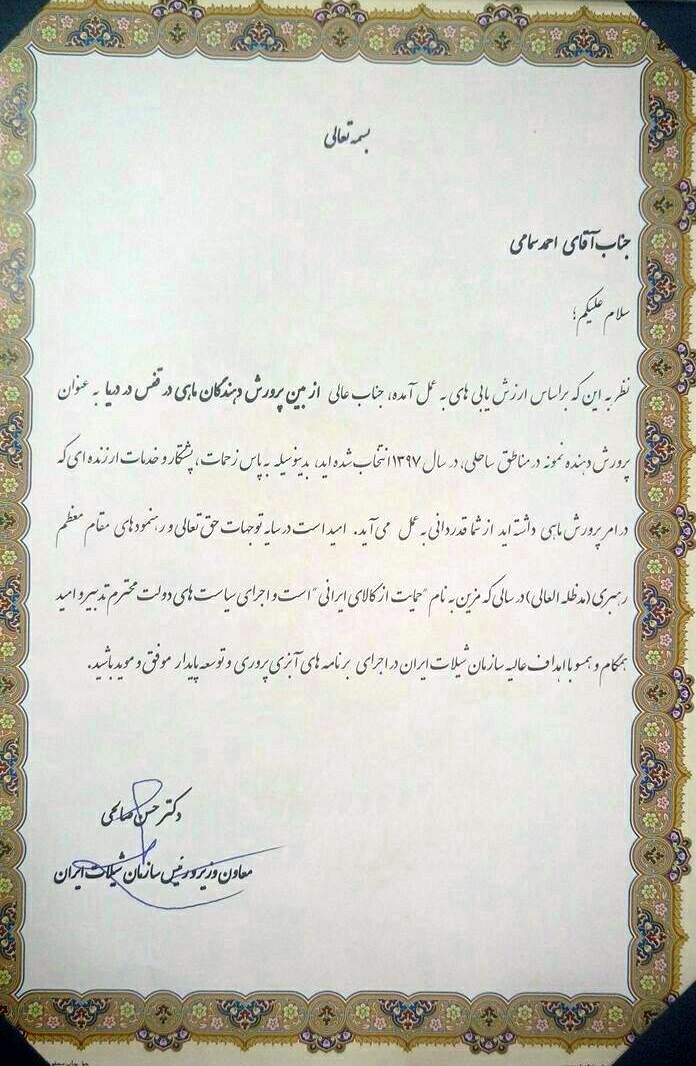 دریافت لوح تقدیر مزرعه الگویی از رئیس سازمان شیلات ایران : تولید کننده برتر پرورش ماهی در قفس در سال تولیدی 97-1396