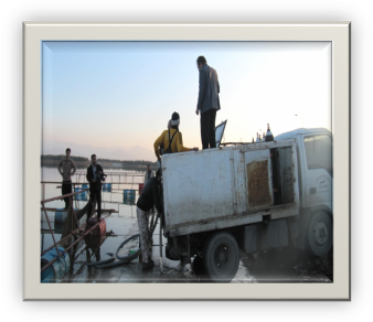 اگر از مخازن استفاده ميشود، بايستي با استفاده از پمپ يا سطل، آب منبع آبي را به داخل مخزن ريخت تا آب مخزن تقريبا همدماي آب منبع آبي شود. سپس حجم آب را کم کرده و توسط لوله به داخل قفس منتقل ميکنند.