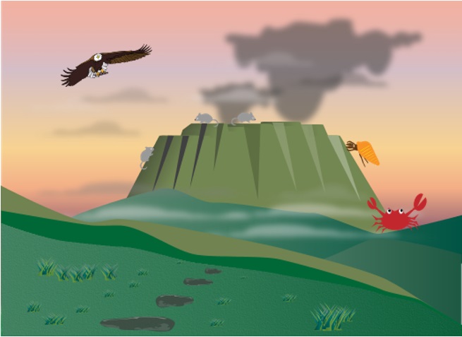 On a mountain, the weather and the organisms that live there change often as the elevation increases. As temperatures get colder, tree species change and then eventually disappear all together. At the top there is usually nothing but snow and ice.